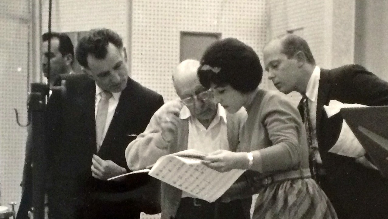 The photo above shows Pearl in a session and consulting with Igor Stravinsky. The photo to the right shows Pearl at a recording session while composers Franz Waxman and Alfred Newman take turns conducting the studio orchestra.